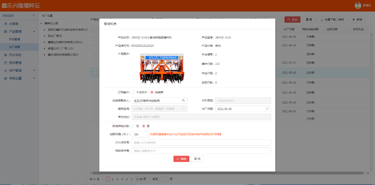 - 產品管理:為播種機(農機)生產廠家和其他農資(機)經銷商提供產品信息(產品描述、技術參數、配置及說明)管理;同時可為播種機(農機)生產廠家、播種機(農機)經銷商提供相應的銷售區(qū)域管理。