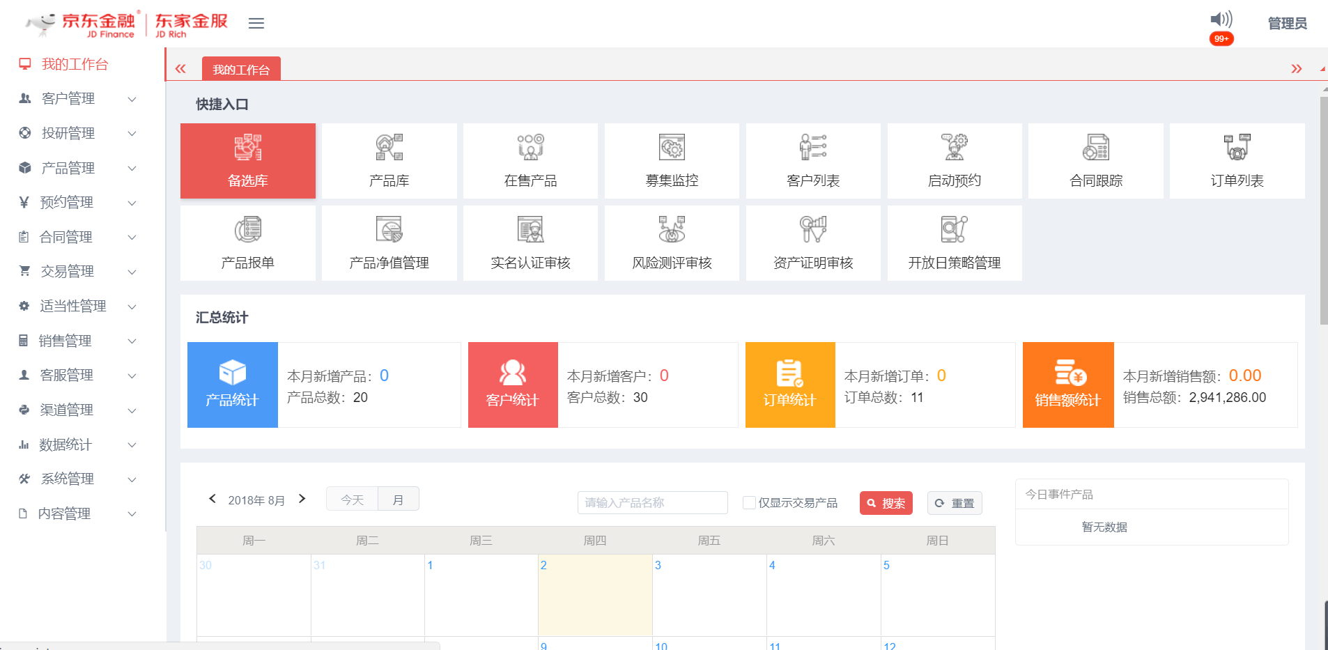 - 我的工作臺(tái):提供系統(tǒng)菜單快捷入口,統(tǒng)計(jì)核心業(yè)務(wù)數(shù)據(jù)及開放期內(nèi)的產(chǎn)品日歷事件展示