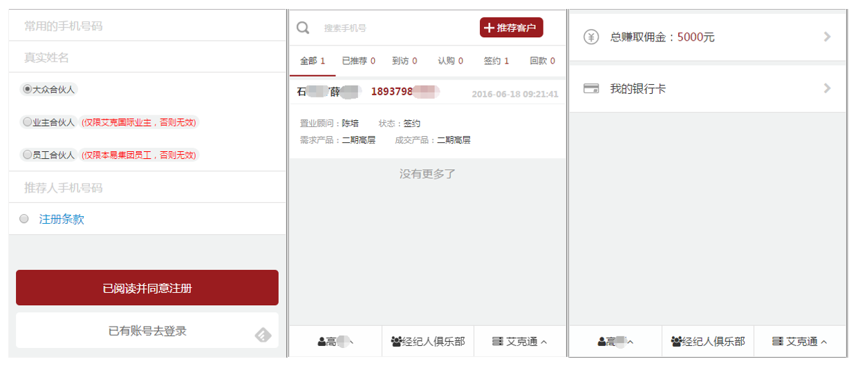 客戶注冊:擁有微信并關注公眾號,即可注冊申請成為全民營銷系統(tǒng)的用戶(全民經(jīng)紀人)。注冊用戶可隨時通過微信查看已經(jīng)推薦的客戶信息、購房進度、傭金結算情況。